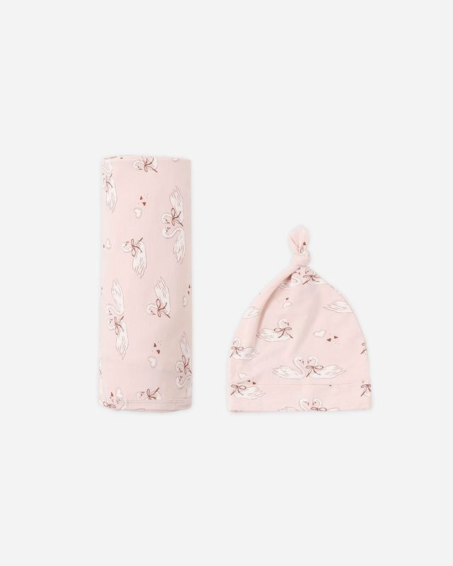 Velvety soft baby swaddle made out of our signature bamboo fabric with a matching bamboo knotted hat.Featuring our 'valentines' print for your little valentines.Care: Machine wash cold on delicate. Hang to dry.Made of 94% viscose from bamboo / 6% elastane.