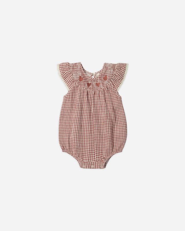 The Lenore Romper features ruffle sleeves with crochet lace trim, smocked neckline with red embroidered hearts, button at back neck, elastic leg openings and bottom snap closures for easy changes and a perfect fit.