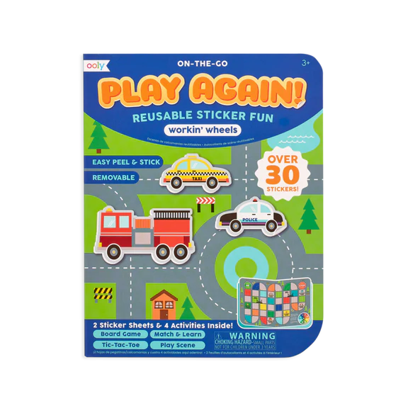 This activity kit will encourage your child’s imagination with removable, easy peel stickers that can be used over again. The activity board book is sturdy and sized at 6.5 x 8.5 inches with lots of room for play. With 30 plus reusable stickers that can be used on the play scene board page, learn & match board page, tic tac toe board page and the game board page with a spinner wheel. Working wheels Play Again! Mini On-The-Go-Activity Kit will supply imaginative playtime anywhere with no mess, just plenty of fun!